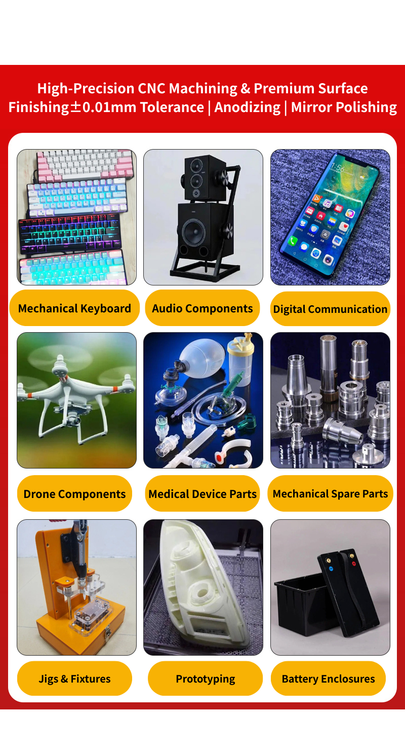 Dongguan Yiwei Precision Hardware Co., Ltd. was established in 2017 and is located in Qingxi Town, Dongguan. The company possesses CNC four-axis and five-axis machining centers along with CNC lathes, specializing in the precision machining of components made from aluminum alloy, stainless steel, plastic, copper, and other materials. We also provide customers with surface treatments including sandblasting, brushing, anodizing, electroplating, and electrophoresis. Our machined products are widely used in mechanical keyboard aluminum alloy housings, audio panels, digital communications, drones, medical devices, mechanical components, jigs, automation equipment, battery casing prototypes, and more. With a team of experienced engineering technicians, we accept custom orders based on customer drawings, samples, or materials, and collaborate on preliminary product design development. Guided by the principle of “Quality First, Service Foremost,” we deliver qualified products and premium services through exceptional expertise and professional dedication. We look forward to partnering with clients to build a brighter future together.